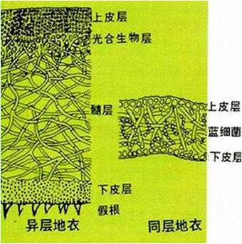 藻类或蓝细菌与真菌共生所形成的地衣是共生关系的典型代表,藻类和蓝细菌通 过光合作用向真菌提供有机养料,固氮蓝细菌还可以同时供给有机氮素营养,真菌则利用菌丝的吸收作用为藻类和蓝细菌提供水、矿质养料及某些生长素和在基质上牢固附着的条件,这一共生关系使地衣具有极强的适应性和生命力。