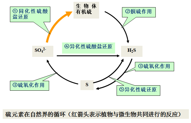 微生物可以通过同化硫酸盐还原作用、脱硫作用、硫化作用、异化性硫酸盐还原作用、异化性硫还原作用参与硫素循环。