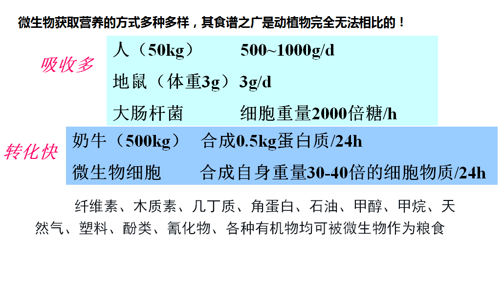 由于微生物的比面值大得惊人,所以与外界环境的接触面特别大,这非常有利于微生物通过体表吸收营养和排泄废物,就使它们的“胃口”十分庞大。而且,微生物的食谱又非常广泛,凡是动植物能利用的营养,微生物都能利用,大量的动植物不能利用的物质,甚至剧毒的物质,微生物照样可以视为美味佳肴。 我们可以利用微生物这个特性,发挥“微生物工厂”的作用,使大量基质在短时间内转化为大量有用的化工、医药产品或食品,为人类造福,使有害物质化为无害,将不能利用的物质变为植物的肥料。