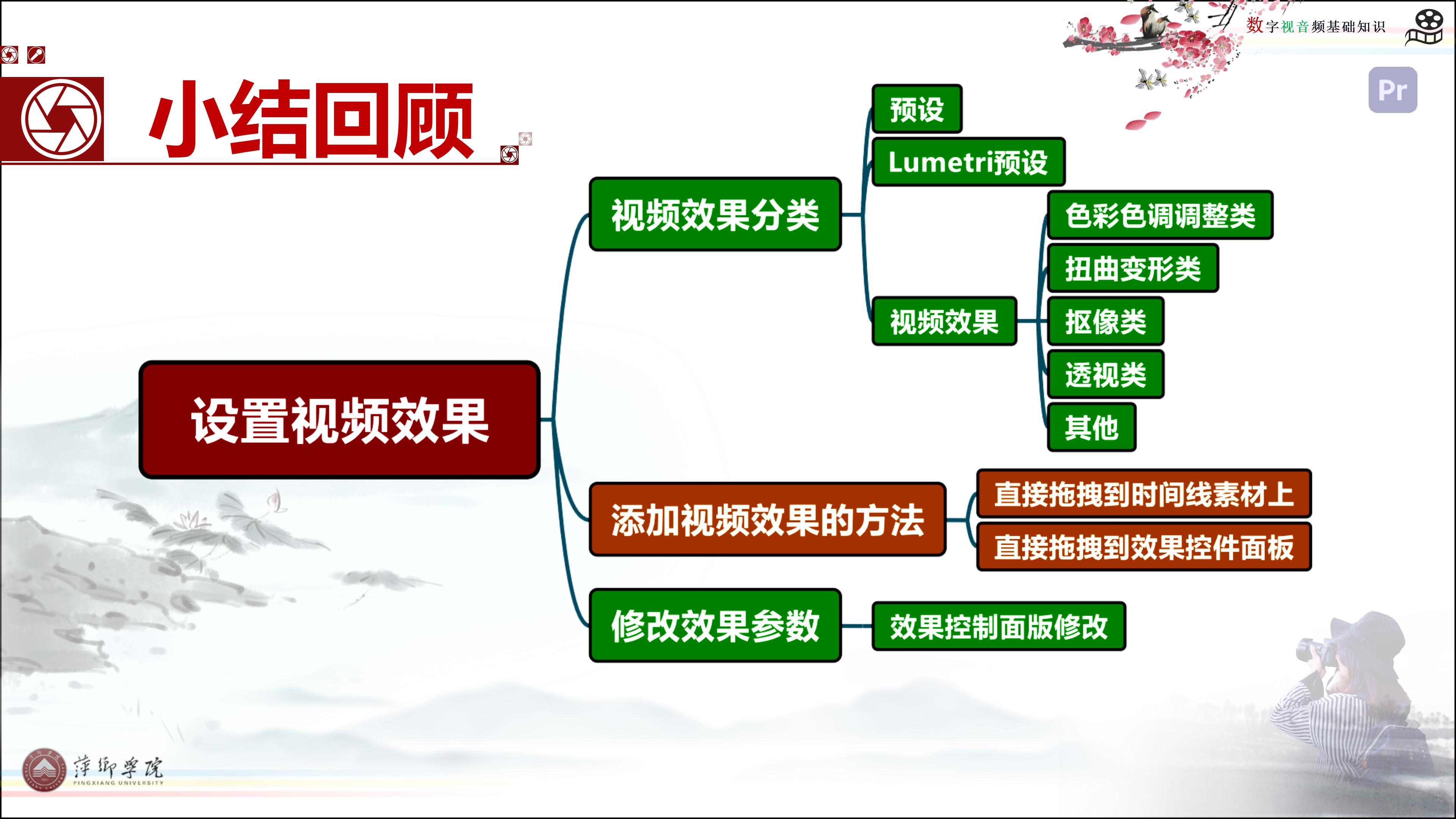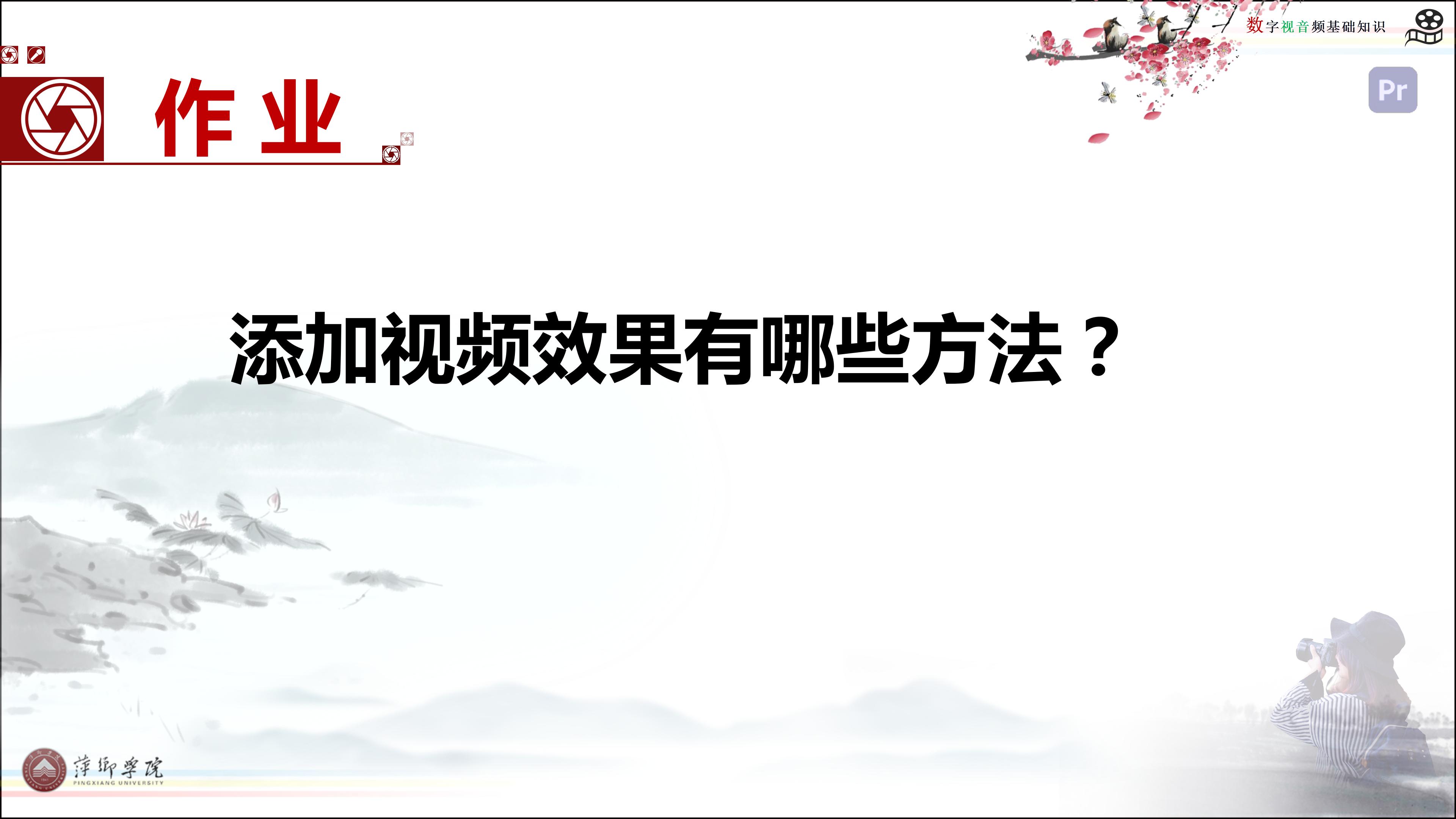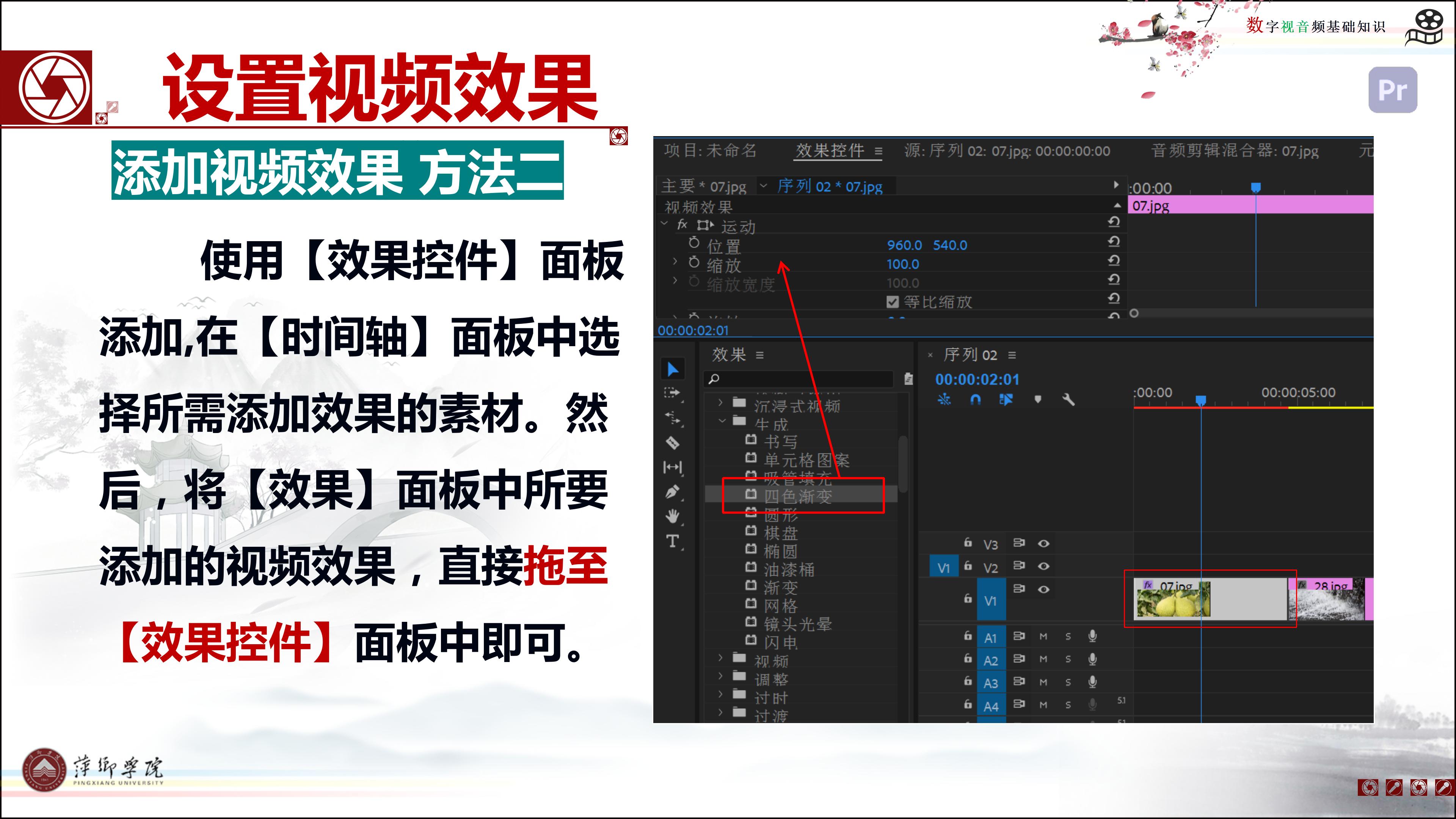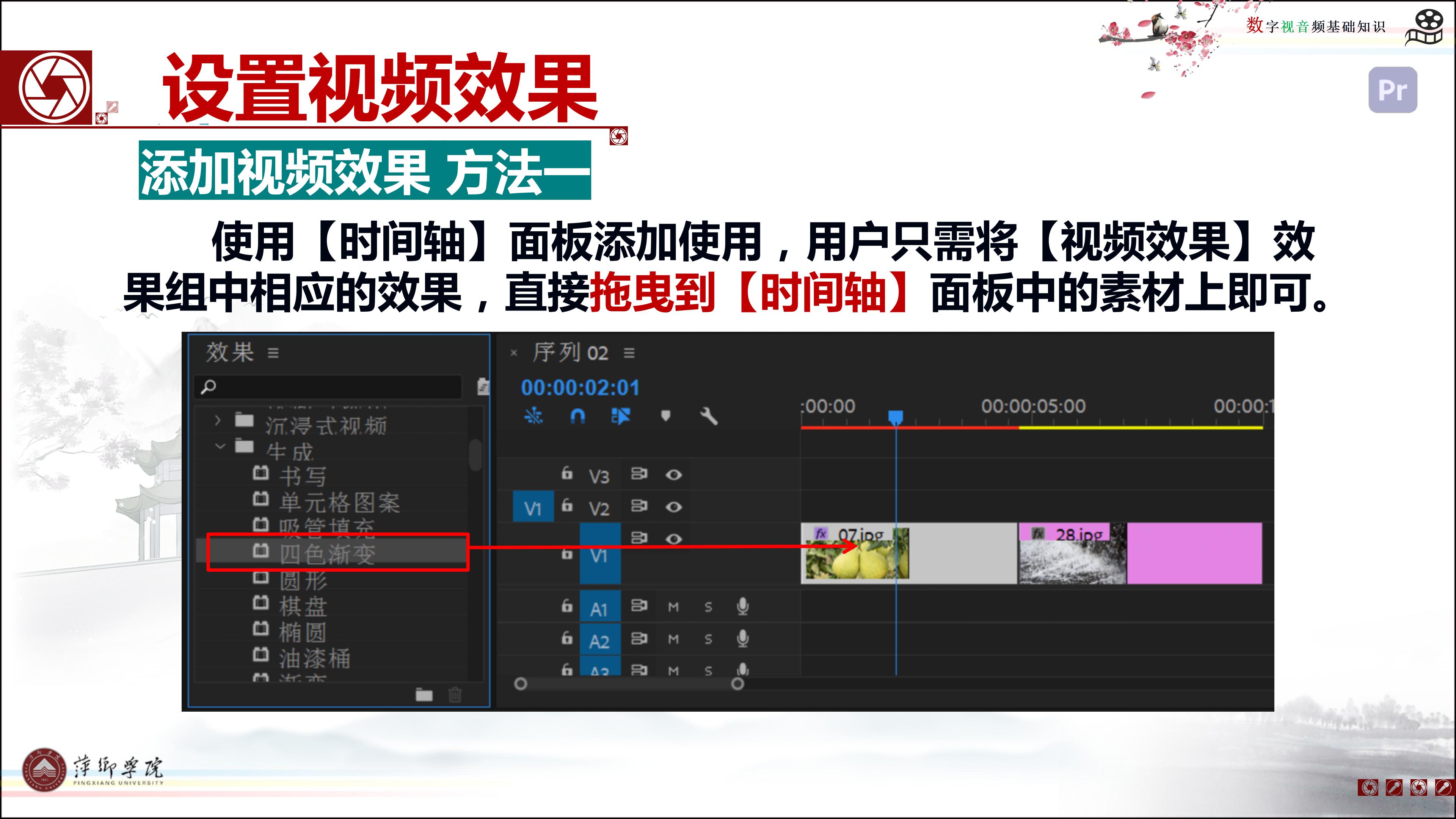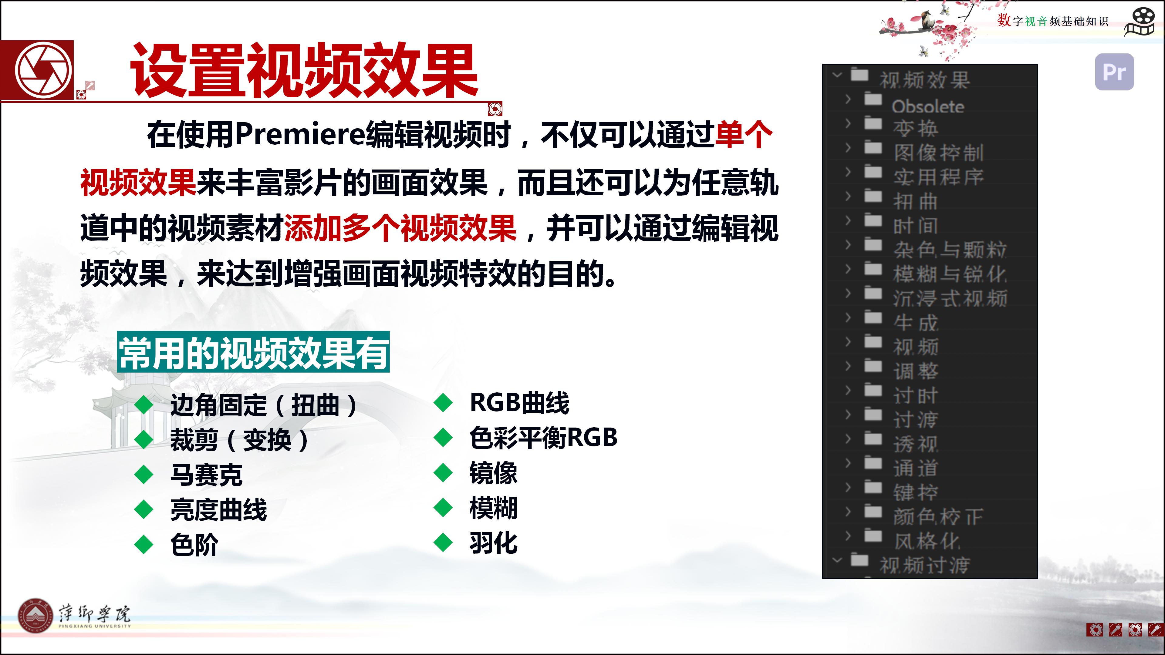 同学们好! 我是汤老师。这节课,我们来学习Premiere视频效果。Premiere为用户提供了100多种视频效果,所有效果按照类别被放置在【效果】面板中的【视频效果】下各个效果组中,以方便用户对其进行查找和应用。
