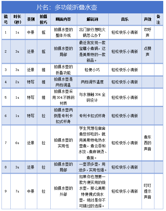 在进行短视频拍摄时,拟定一份短视频脚本,可以让摄影师清晰知道每个机位、镜头大小、拍摄时长等;让演员熟练掌握视频画面、台词、道具等;让剪辑师明确画面衔接设计、音乐卡点、画面时长、色调风格等。因此,一个视频内容的好坏跟视频脚本制作的好坏密切相关。