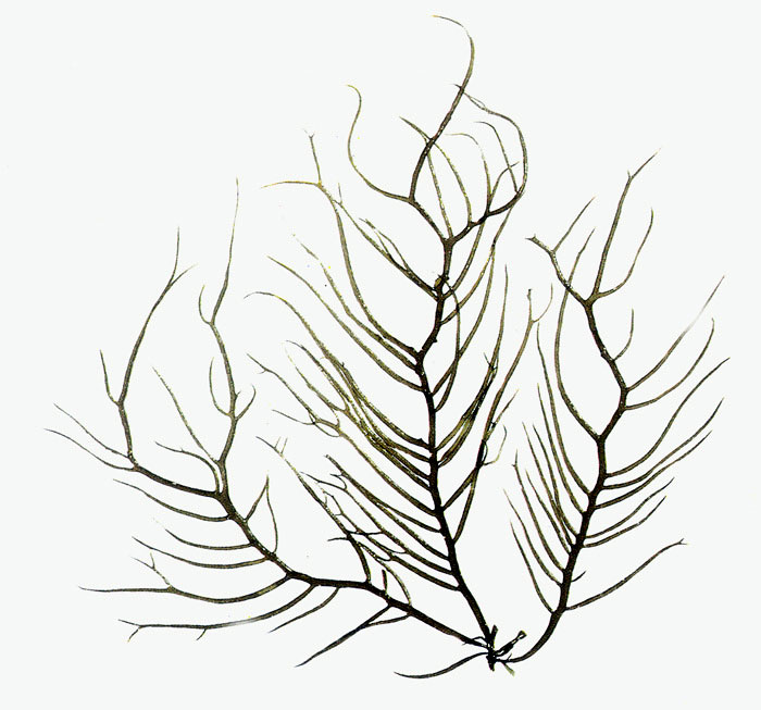 (2)江蓠 [Gracilaria verrucosa (Huds.) Paperfuss]:藻体直立,丛生,主干和分枝均为细圆柱形,为主要的经济海藻,可食用,是提取琼胶的优质原料;