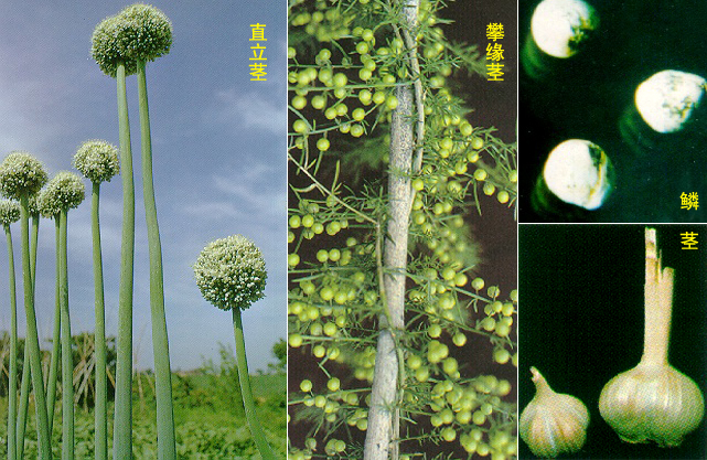 3、蒜 Allium satium L.:鳞茎分为数瓣,封闭在白或淡紫色的膜内的叫蒜头。花葶圆柱状叫蒜苔,作蔬菜或调料。另幼株全株食用。大蒜中含杀菌物质。