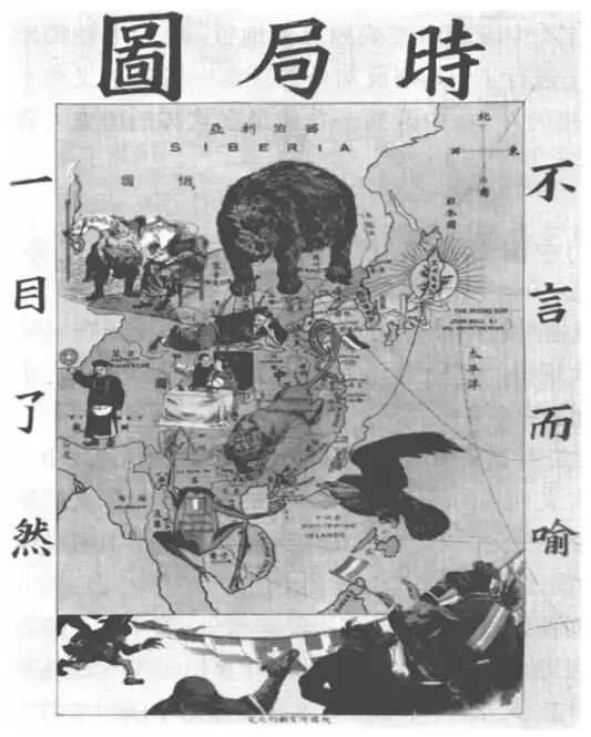 ★清末反映列强侵略中国形势的《时局图》(作者佚名)。图中熊代表沙俄,虎代表英国,蛇代表德国,蛤蟆代表法国,太阳代表日本,鹰代表美国。