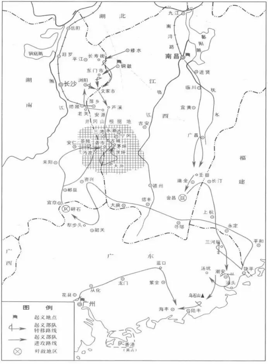 南昌、秋收(湘赣边)、广州起义及向井冈山进军示意图 (1927年8月-1928年4月)