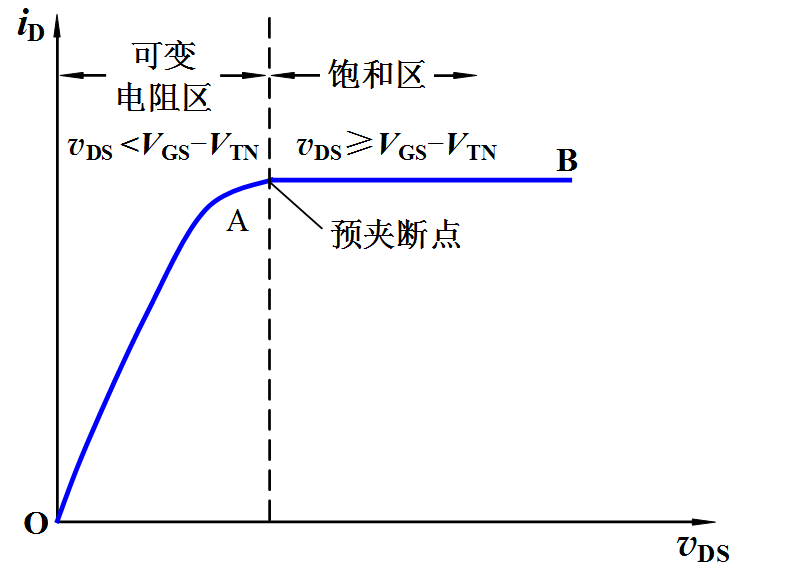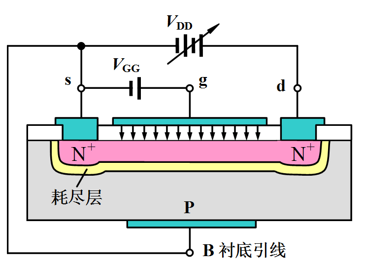 耗尽型与增强型主要区别是在制造SiO2绝缘层中有大量的正离子,使在P型衬底的界面上感应出较多的负电荷,即在两个N型区中间的P型硅内形成一N型硅薄层而形成一导电沟道,所以在VGS=0时,有VDS作用时也有一定的ID(IDSS);当VGS有电压时(可以是正电压或负电压),改变感应的负电荷数量,从而改变ID的大小。VP为ID=0时的-VGS,称为夹断电压。