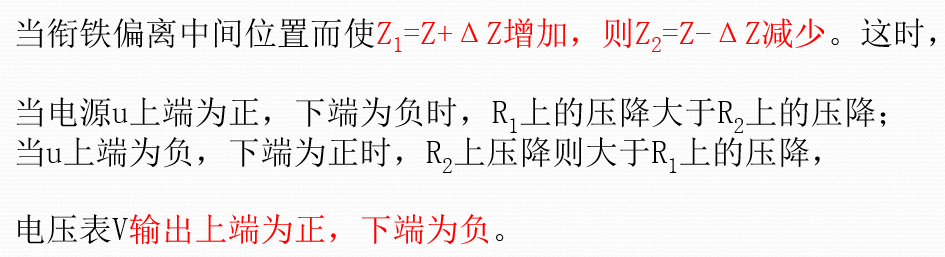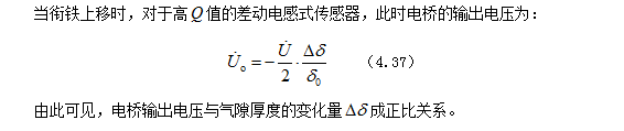 将两个电感线圈接入交流电桥的相邻桥臂,另两个桥臂由电阻组成,电桥的输出电压与电感变化量有关。当衔铁上移时有: