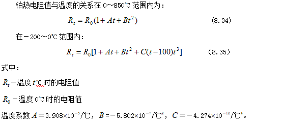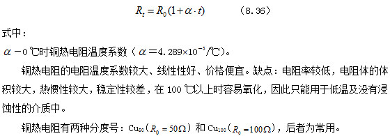 铂热电阻虽然优点多,但价格昂贵,在测量精度要求不高且温度较低的场合,铜热电阻得到广泛应用。在-50~+150°C的温度范围内,铜热电阻与温度近似呈线性关系,可用下式表示: