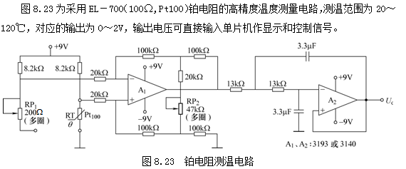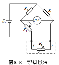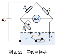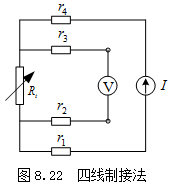 三线制接法是工业测量中广泛采用的方法。在高精度测量中,可设计成四线制的测量电路,如图8.22所示。