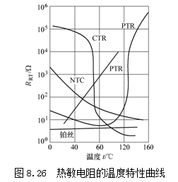 根据半导体的电阻-温度特性,热敏电阻可分为三类,即负温度系数热敏电阻(NTC)、正温度系数热敏电阻(PTC)和临界温度系数热敏电阻(CTR)。它们的温度特性曲线如图8.26所示。