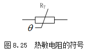 热敏电阻是利用半导体的电阻值随温度显著变化这一特性制成的一种热敏元件,其特点是电阻率随温度而显著变化。它主要由敏感元件、引线和壳体组成。根据使用要求,可制成珠状、片状、杆状、垫圈状等各种形状。热敏电阻的符号如图8.25所示。