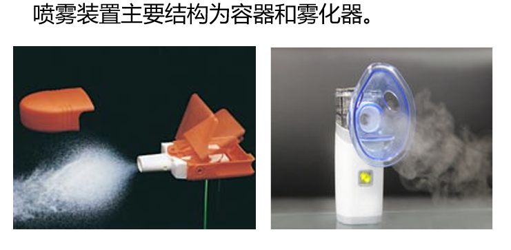 喷雾剂(nebula): 系指原料药物与适宜辅料填充于特制的装置中,使用时借助手动泵的压力、高压气体、超声振动或其他方法将内容物呈雾状物释出,用于肺部吸入或直接喷至腔道黏膜、皮肤及空间消毒的制剂。