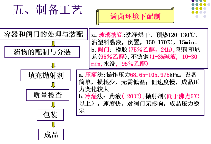 ③其他:碳氢化合物(丙烷,正丁烷等,稳定、毒性小,但易燃易爆,故常与氟利昂合用);压缩气体(二氧化碳、氮气、一氧化氮等,性质稳定,不燃烧,较安全,常用于喷雾剂)