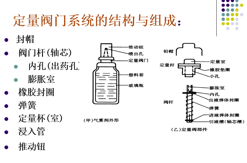 气雾剂(aerosols) :系指药物与适宜抛射剂封装于具有特制阀门系统的耐压容器中,使用时借助抛射剂的压力将内容物呈雾状喷出到达用药部位,起局部或全身作用。