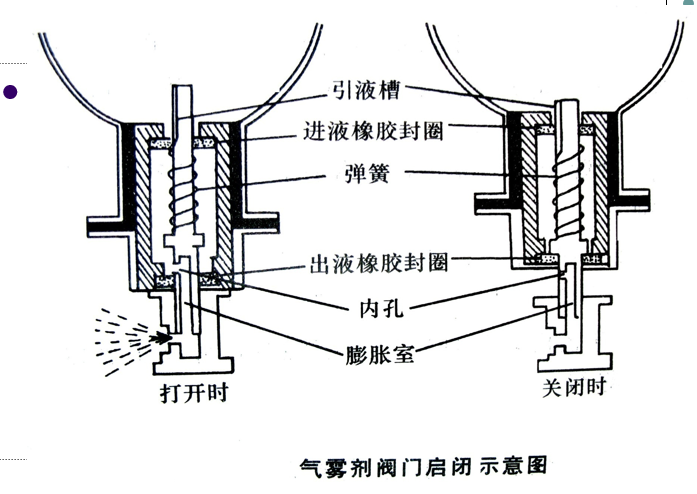 (1)工作原理:液化气体处于一种高压状态,一旦阀门开放,压力突然降低,急剧气化,喷出。