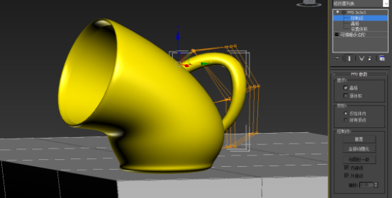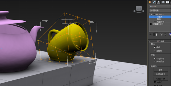 5.使用同样的方法,选择子茶壶的壶把添加FFD3*3*3修改器,注意先调整壶把的位置,然后再调整修改器。