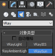 9.点击创建面板下的灯光/vray灯光,选择Vraysun,进入vray sun系统,系统会自动带上一个VRay天光,阳光的高低也决定这阳光的亮度,如图3-10所示。