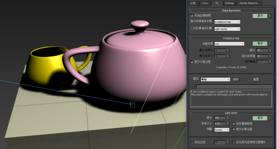 11. 进入VRay渲染器设置面板,修改渲染参数,打开GI面板,勾选开启全局照明,选择首次反弹渲染引擎为发光图,二次反弹渲染引擎为灯光缓存,发光图设置面板预设为低或非常低,灯光缓存细分为100-300。
