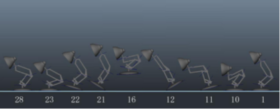 1. 确定主要关键帧的动作,在第1帧位置,确定台灯的初始动作,在第10帧位置,确定台灯起跳前的预备动作,此时台灯身体弯曲,重心下降,灯头向前看。