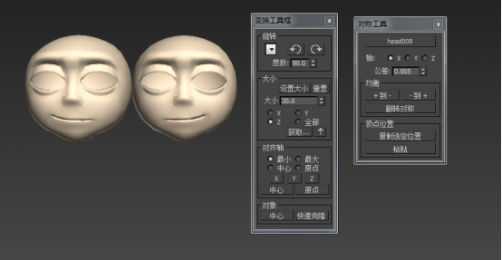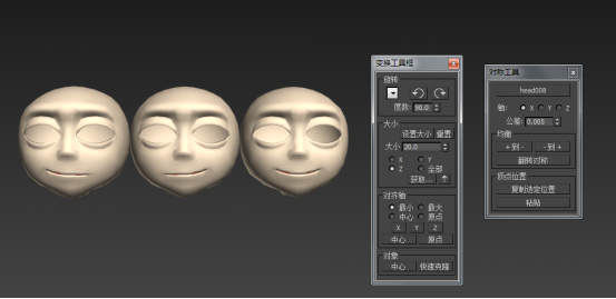 7. 再快速克隆一个,点击对称工具下的+到—按钮,这样复制出来的人头右嘴角上翘的效果同时加载到左边。