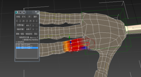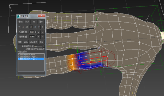 10.手指骨骼封套,先找到手指指节骨骼与骨骼之间的交界处的顶点,将这些顶点的权重值分别设为0.5,平均分配为两个相交骨骼上。