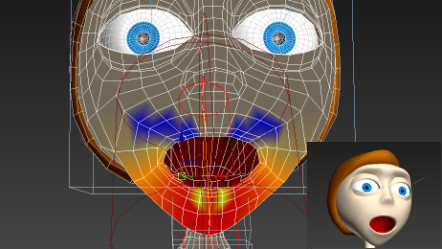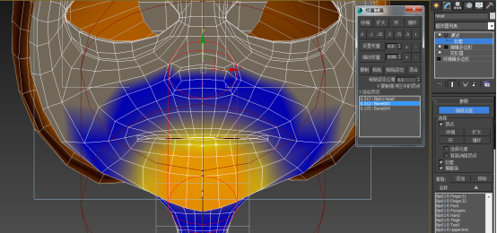 7.对所选择的点,根据角色张嘴的嘴型进行权重值的分配,注意口轮匝肌上部在张嘴时也会进行肌肉的一定程度的拉伸。
