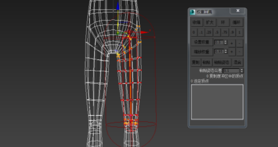 8.选择腿部模型,进入封套层级,勾选顶点选项,在视图中选择左腿上的顶点,单击权重工具,为腿部的顶点分配权重值。