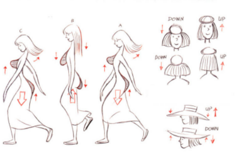 在表现头发以及衣料时也会用到反作用的方法。当人物站起来的时候,布料、头发或是软的东西就会向下运动。我们可以稍微夸张一下这种现象,让我们的角色活灵活现起来。看看一个女人在走路的时候她的头发、胸部和臀部的运动该如何表现。