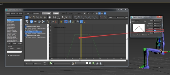 可以看到,调整连续性,数值为0,就相当于Max曲线编辑器里面的把线打成直的。 再来调整躯干垂直的曲线: