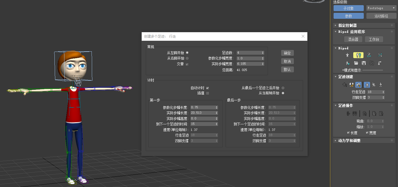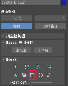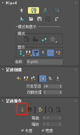 1. 选择角色任意骨骼,打开“运动”面板。在“Biped”卷展栏中,启用“足迹模式”。
