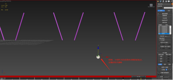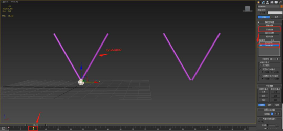 3. 创建小球,在起始帧位置,小球与圆柱体进行链接约束,小球随cylider001圆柱体运动。