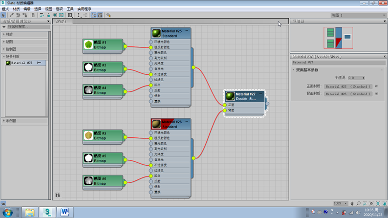 思路:使用slate材质编辑器,应用双面材质类型,分别编辑正面、背面两个子材质。在两个材质的不同贴图通道内贴图。