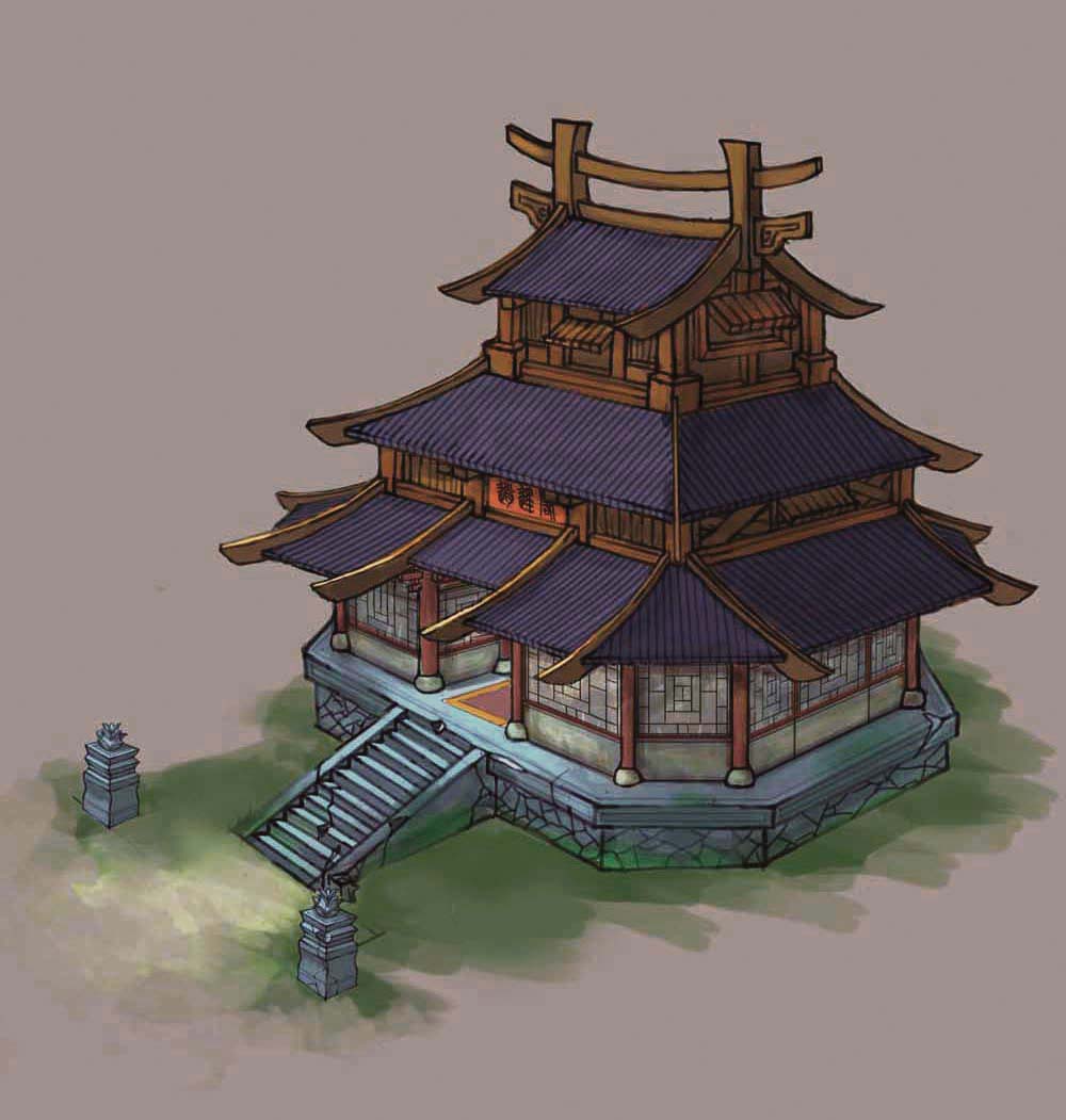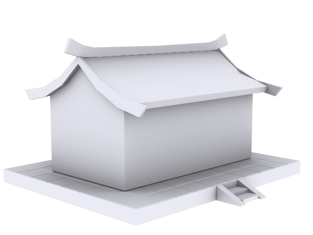 此建筑按照游戏低模的要求建模,按照从上向下的顺序建模,通过贴图实现门窗、瓦片细节。
