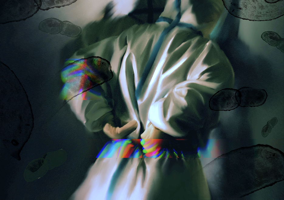 三个奋战在前线的医护人员,在昏暗的环境中,匆匆奔向透着微光的门。各种病毒潜伏在暗处,而他们却无暇顾及。防护服下,我们并不知道他们是谁,只能看到他们忙碌的背影。