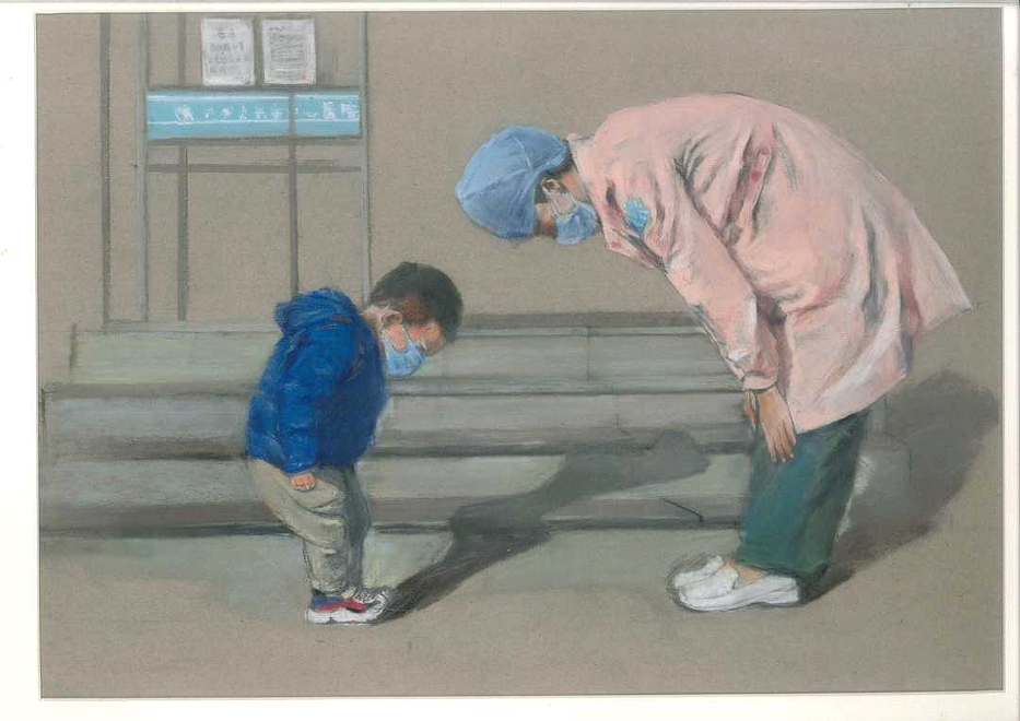 作品简介:今年是艰难的一年,也是亢奋人心的一年,突发的疫情打破了我们每个人生活的节奏,对此我们国家以强烈的优势与其他国家产生对比,这都是因为我们中国共产党的领导,抗疫期间涌现出许许多多优秀的人物,有医生,警察,各行各业的务工人员,以及默默无闻的不留名人士,他们都用自己的行动证明我们国家的强大,人民的团结,一个场景印在我的脑海里,就是这幅画的名字“最萌鞠躬礼”,我的这幅作品主要表达了一个两岁的小孩子在疫情期间经过几天的诊断,最后发现是普通感冒的小孩子出院对住院期间照顾他的护士姐姐鞠躬,护士姐姐也回了他一个鞠躬,我就想用小孩子的稚嫩表达出“健康成长”的主题,用他们都戴着口罩,以后身后医院大门上面张贴的自觉佩戴口罩接受检查的告示来体现出当时疫情期间的一个环境,也体现出“珍爱生命”的一个主题用色粉显示出人物的明亮与后面背景的灰暗做对比,也表现出不管当时的环境是怎样的,我们心中都有明亮。这幅画的创作来源于一张图片,当时疫情期间,我看到这张图片深有感触,我看到这个鞠躬礼很感动,我觉得在疫情期间我们才明白生命的可贵,希望每个人都能珍爱生命,健康成长。相信这个小孩子以后也会以这位护士为榜样,我们中华人民共和国从不缺优秀的榜样!即将迎来共产党成立一百周年,相信我们的国家一定会越来越好,我们要担负起名族复兴的伟大重任,向着共产党,共产党万岁!