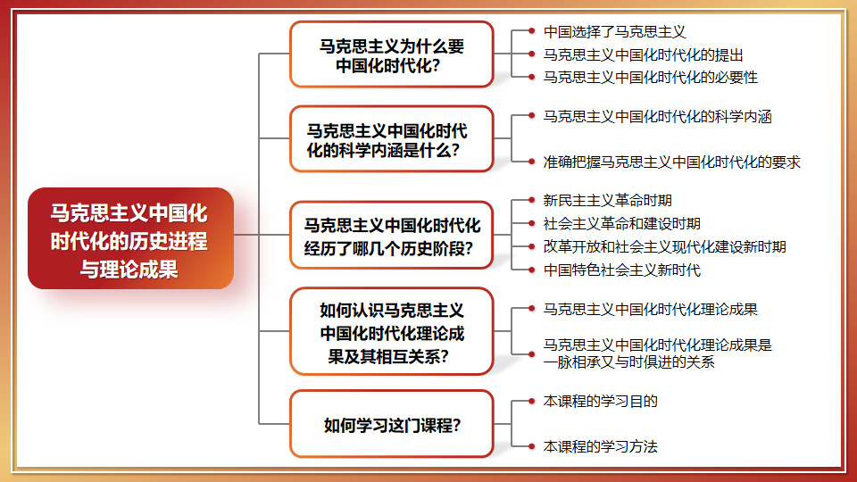 导论部分包括五目:一是“马克思主义中国化时代化的提出”;二是“马克思主义中国化时代化的内涵”;三是“马克思主义中国化时代化的历史进程”;四是“马克思主义中国化时代化理论成果及其关系”;五是“学习本课程的要求和方法”。导论属于本课程的总论部分,能否讲授好这部分内容,不仅关系到学生对导论内容的把握,而且关系到学生对本课程的总体认识和学习态度。