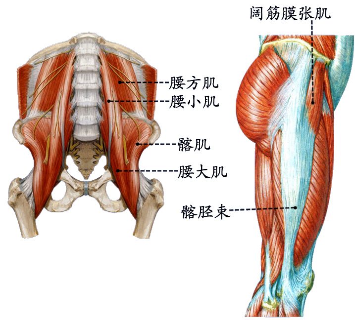 髂腰肌 | 脊柱腰段的外侧和髋关节的前方 | 髋关节前屈和旋外 |