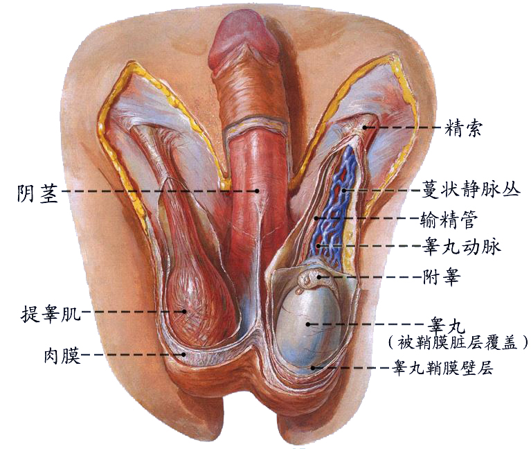 精索为一对柔软的圆索状结构,从腹股沟管内口穿经腹股沟管,出外口(皮下环)后延至睾丸上端。它由输精管、睾丸动脉、蔓状静脉丛、神经、淋巴管等结构外包三层被膜构成。蔓状静脉丛的扩张、迂曲可影响精子的产生和精液的质量,是男性不育症的因素之一。