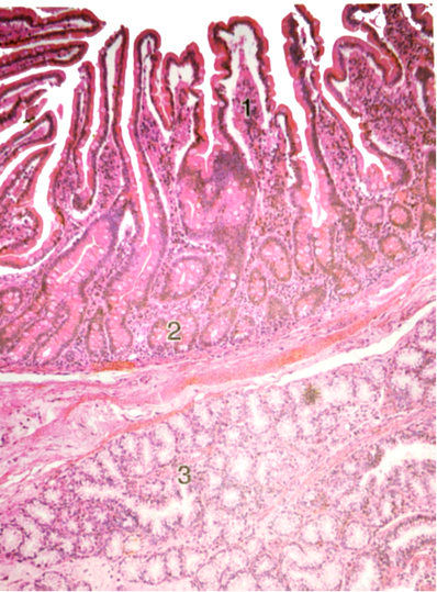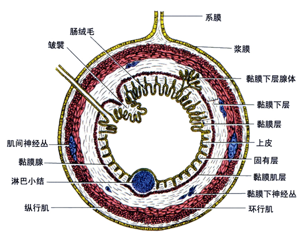 (2)低倍镜观察:粘膜表面有许多呈叶状突起的小肠绒毛,固有层内含有小肠腺。粘膜下层为疏松结缔组织,含有较多血管和淋巴管。肌层由内环行和外纵行两层平滑肌组成。外膜为浆膜。