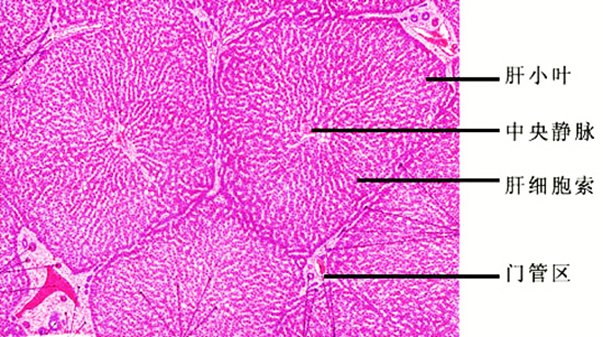 (2)低倍镜观察:猪肝切片肝小叶分界清楚,中央静脉位于肝小叶中心,呈圆形或椭圆形,其周围有呈放射状排列的肝索,其形状不规则,肝索之间为肝血窦,相邻几个肝小叶之间为门管区。人肝切片肝小叶分界不明显。