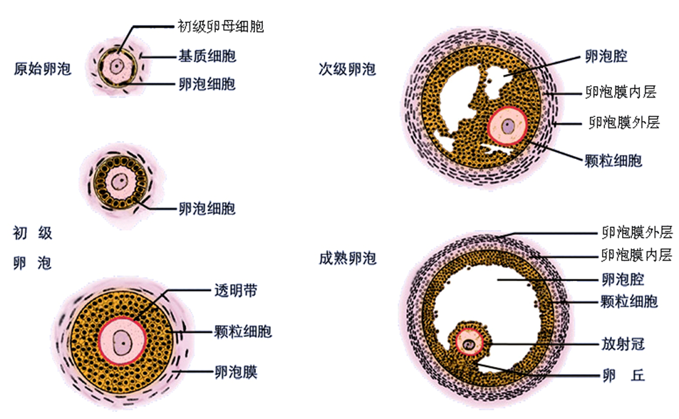 1)原始卵泡:位于卵巢皮质的浅层。中央部有一个大而圆的卵母细胞,染色较浅;围绕卵母细胞周围是一层扁平细胞,即卵泡细胞。