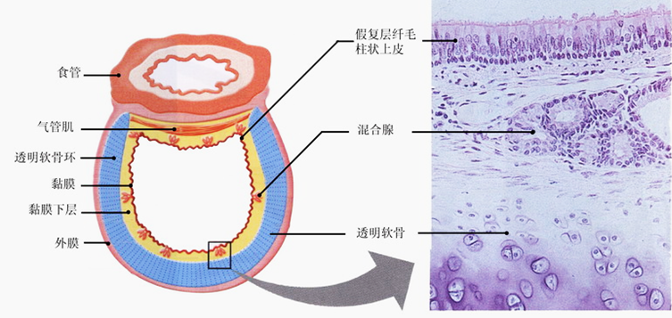 (2)低倍镜观察:靠近管腔呈淡紫红色区域为粘膜层,其上皮为假复层纤毛柱状上皮。粘膜层与透明软骨之间淡红色的区域为粘膜下层,由疏松结缔组织组成,内有较多的混合性腺。外膜较厚,由透明软骨及外周的平滑肌构成。