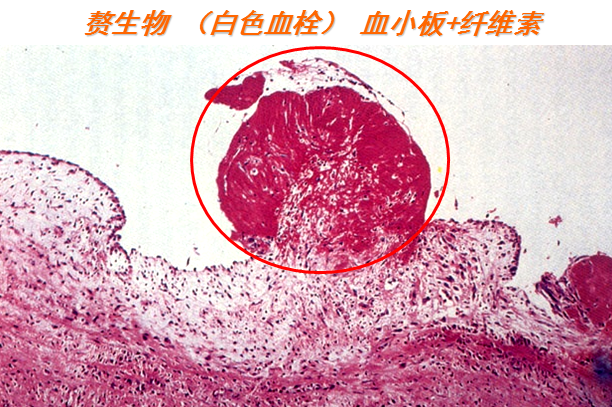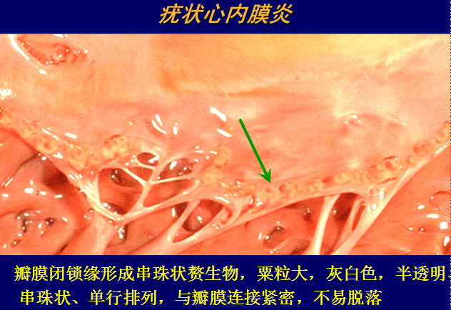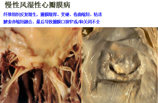 (1)风湿性心内膜炎:主要侵犯心瓣膜,以二尖瓣最多见,其次为二尖瓣和主动脉瓣同时受累。急性期:瓣膜闭锁缘疣状赘生物(白色血栓)形成,直径1-3mm,灰白色,串珠状,不易脱落。镜下,为血小板和纤维素构成的白色血栓。病变后期,赘生物发生机化,导致瓣膜增厚、变硬、卷曲、缩短,瓣叶间相互粘连,腱索增粗、缩短,最终导致瓣膜病(瓣膜口狭窄和关闭不全),造成全身血液循环障碍。