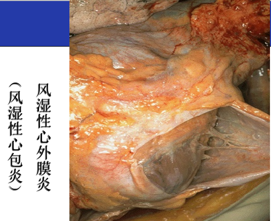 (3)风湿性心外膜炎:病变主要累及心包脏层,呈浆液性或浆液纤维素性炎,偶有风湿小体。当以大量纤维素渗出为主时,覆盖在心外膜表面的纤维素可因心脏搏动牵拉而成绒毛状,称为绒毛心(干性心包炎)。当以浆液渗出为主时,形成心包炎性积液(湿性心包炎)。以后风湿病变消退,浆液和纤维素如不能完全溶解吸收,可发生机化,使心包脏层和壁层发生局部粘连,甚至形成缩窄性心包炎(constrictive pericarditis)。
