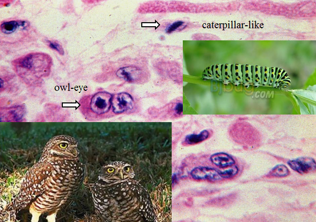 Aschoff细胞胞浆丰富,略带嗜碱性,核大呈空泡状,圆形或长圆形,染色质集于中央,在核的横肉切面形似枭眼,纵切面形似毛虫状,可有双核或多核。
