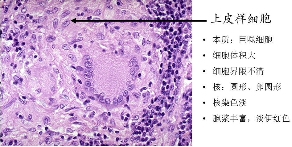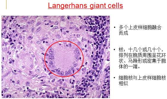 镜下:典型结核结节(tubercle)中央有干酪样坏死,周围由上皮样细胞、朗格汉斯巨细胞加上外周局部集聚的淋巴细胞和少量反应性增生的成纤维细胞构成。