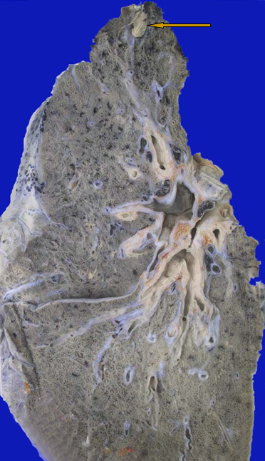 肉眼:常位于肺尖下2-4cm处,直径0.5-1cm,病灶境界清楚,有纤维包裹。