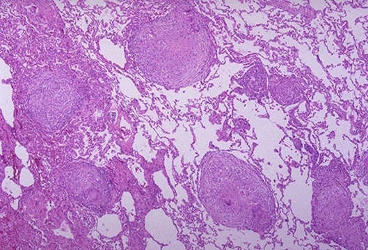 镜下:病变以增生为主,中央为干酪样坏死。