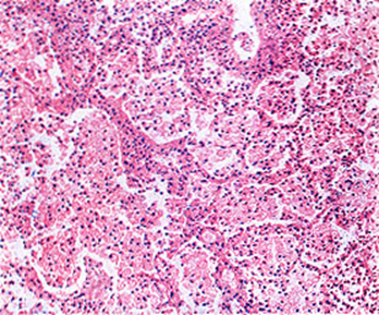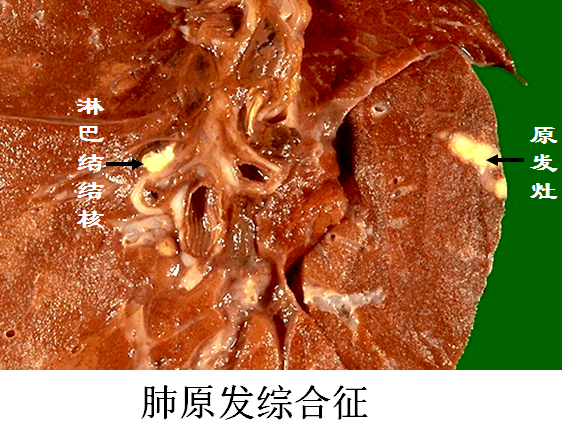 肺的原发病灶:在通气较好的上叶下部或下叶上部近胸膜处形成1-1.5cm大小的灰白色炎性实变灶(Ghon灶),绝大多数病例病灶中央有干酪样坏死。