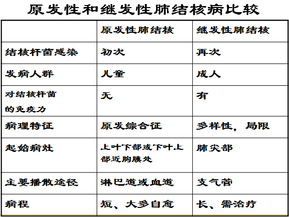 (重点!)原发性肺结核与继发性肺结核在许多方面有不同的特征,其差别见表2。